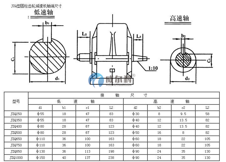 JZQ齒輪減速機應用范圍及結構概況 1、應用范圍及優(yōu)點: 本機廣泛應用于各種起重、運輸、礦山機械及其它各種機械中作減速之用。其聯(lián)動方式,可用聯(lián)軸器直接聯(lián)動,也可用三角皮帶撓性聯(lián)動。 本機通用性和互換性強,維修簡單,效率系數為0.94,具有起動阻力小,運動靈活等優(yōu)點。 2、結構概況及主要零部件: 本機結構型式為兩級三軸圓柱斜齒水平分割全封式。潤滑油盛于減速機之內部,在主動軸和中間軸上設有擋油板,各軸支點均用滾動軸承,其軸向間隙,可用內部調整環(huán)調整之,本機上部有一檢查蓋,下部有油標指針和排廢油用的油塞。
